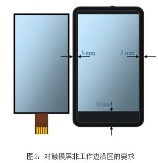 對尺寸小于4英寸(10厘米)的觸摸屏,觸摸屏的邊沿寬度,在觸摸傳感器尾線一側應不窄于10mm,與尾線側毗鄰的兩側應不窄于3mm。這個邊沿空間用于隱藏把透明的ITO圖案鏈接到控制電路的非透明銀質箔線并隱藏控制電路本身。對于使用玻璃基底的觸摸屏,邊沿的寬度或許可以做得更窄,但仍建議使用上述指導原則。圖2 描述了這些指導原則。
