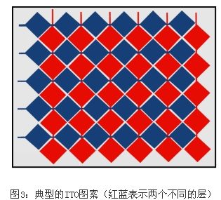 在完成了機械評估之后,必須為觸摸屏選擇一個合適的基底。圖3 顯示了投射式電容觸摸屏的一個典型ITO圖案。
