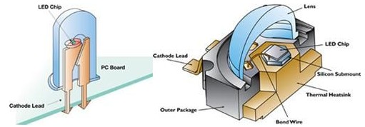 傳統炮彈型封裝,以插件式運用,廣泛運在家電或是通訊產品的指示燈,常看到的顏色多為紅、黃、綠色光等,但因為大部分LED產生的熱只能藉由2根導線,往組裝的基板上導熱,散熱效果不佳。
