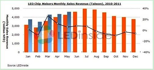 近日消息,據統計,2011年5月臺灣上市上柜 LED  廠商營收總額約新臺幣99.57億元(月成長5.8%、年成長8.3%)。