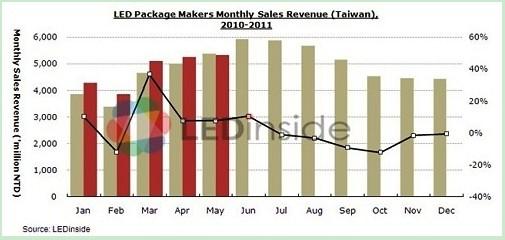 從上游芯片廠營收來看,2011年5月份臺灣上市柜LED芯片/晶粒廠營收46.25億元,與去年同期相比成長8.3%,與上月相較增加5.8%。下游LED封裝方面,5月份臺灣上市柜LED封裝廠營收達到53.32億元,與去年同期相比衰退0.8%,但較上月增加1.6%。