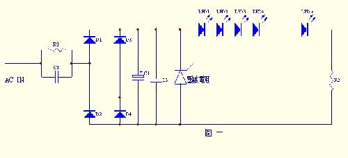圖一為一個實際的采用電容降壓的LED驅動電路。請注意,大部分應用電路中沒有連接壓敏電阻或瞬變電壓抑制晶體管,建議連接上,因壓敏電阻或瞬變電壓抑制晶體管能在電壓突變瞬間(如雷電、大用電設備起動等)有效地將突變電流泄放,從而保護二級關和其它晶體管,它們的響應時間一般在微毫秒級。
