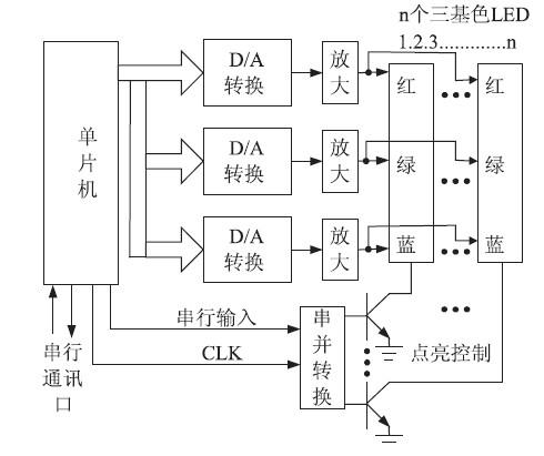 如圖2 中,87LPC762 單片機傳送數(shù)據(jù)到三路D /A 轉(zhuǎn)換器,將數(shù)字量轉(zhuǎn)換為模擬量,經(jīng)功率放大電路分別控制紅、綠、藍三色LED 發(fā)光的強度,從而控制LED 發(fā)光的顏色以及亮度, 對于多個LED采用動態(tài)掃描的方式,由單片機控制兩個輸出端子以CLK 為基準輸出串行信號,經(jīng)串并轉(zhuǎn)換器件控制處于開關工作的三極管分別對三基色LED 進行點亮,完成對圖形圖案的控制。最后,此系統(tǒng)即可完成調(diào)光所需的各項功能。串行通訊接口采用RS232標準總線與計算機連接,可將計算機中需要顯示的圖案或文字傳送到本系統(tǒng)并顯示出來。