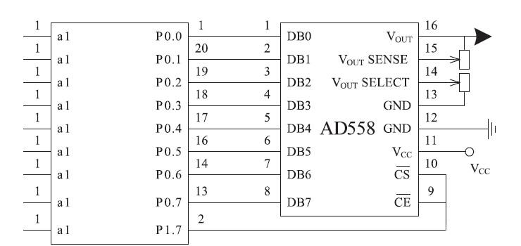 圖3 中AD558 是D /A 轉(zhuǎn)換芯片,能將數(shù)字量轉(zhuǎn)換為模擬量。單片機通過P0 口與AD558 的DB0 -DB7 連接,進行并行數(shù)據(jù)傳輸,以此控制AD558 輸出電壓的高低,輸出電壓通過功率放大控制LED 單色發(fā)光的強度。由于AD558 是8 位的D /A 轉(zhuǎn)換芯片,因此通過三路D /A 分別控制三基色時,其可將三基色中的紅、綠、藍分別分為28 = 256 份輸出,若將三基色任意組合即可最大形成2563 = 16777216 顏色和亮度的組合分辨率,通過軟件數(shù)據(jù)的設定可根據(jù)實際需要設置最大限度內(nèi)任意所需要的分辨率值。