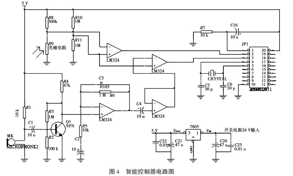 (2)當(dāng)無光(自然光)時(shí),若有人經(jīng)過產(chǎn)生聲響,控制器先判斷時(shí)間段,若是在天色完全暗下來時(shí)(定義為第一時(shí)間段),則使LED發(fā)出100%亮度。其余時(shí)間段即天色還較亮,控制器可輸出50%占空比方波,使LED發(fā)出50%亮度即可,這樣可進(jìn)一步節(jié)省電能,提高用電效率。