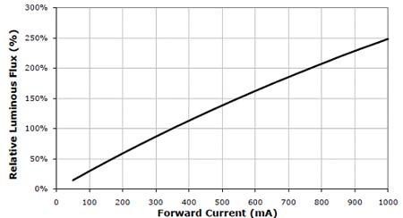 圖1. XLampXP-G的輸出相對(duì)光強(qiáng)和正向電流的關(guān)系