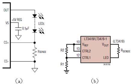 調(diào)節(jié)LED的電流最簡單的方法就是改變和LED負(fù)載串聯(lián)的電流檢測電阻(圖2a),幾乎所有DC-DC恒流芯片都有一個(gè)檢測電流的接口,是檢測到的電壓和芯片內(nèi)部的參考電壓比較,來控制電流的恒定。但是這個(gè)檢測電阻的值通常很小,只有零點(diǎn)幾歐,如果要在墻上裝一個(gè)零點(diǎn)幾歐的電位器來調(diào)節(jié)電流是不大可能的,因?yàn)橐€電阻也會(huì)有零點(diǎn)幾歐了。所以有些芯片提供一個(gè)控制電壓接口,改變輸入的控制電壓就可以改變其輸出恒流值。例如凌特公司的LT3478(圖2b)只要改變R1和R2的比值,也可以改變其輸出的恒流值。