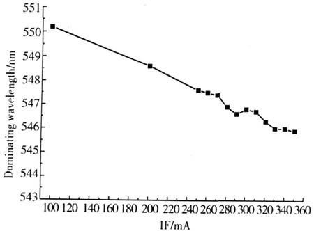 當(dāng)正向電流為350mA時(shí),主波長為545.8nm;當(dāng)正向電流減小為200mA時(shí),主波長為548.6nm;當(dāng)正向電流減小為100mA時(shí),主波長為550.2nm。