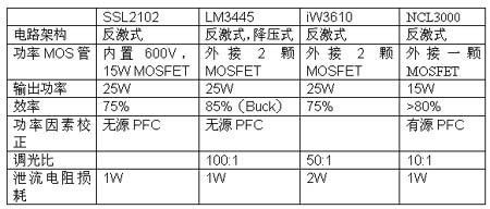 目前市場上主要有恩智浦的SSL2101/2,國半的LM3445,iWatt的iW3610和OnSemi的NCL3000四種兼容可控硅調(diào)光的驅(qū)動(dòng)IC。其特點(diǎn)如下: