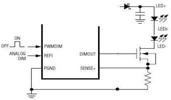 具體實(shí)現(xiàn)PWM調(diào)光的方法就是在LED的負(fù)載中串入一個(gè)MOS開關(guān)管(圖8),這串LED的陽極用一個(gè)恒流源供電。