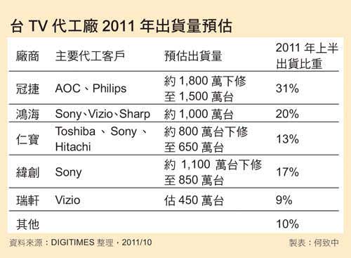 液晶電視制造龍頭冠捷雖握有自有品牌AOC與飛利浦(Philips)品牌訂單,但亦因整體市場需求不佳,下調2011年出貨量,從原先1,800萬臺下修至約1,500萬臺;緯創第3季表現雖相對較佳,出貨量仍逐月成長,一路從55萬臺爬升至80萬臺,然近期亦將全年液晶電視出貨量從1,100萬臺下修至約850萬臺;至于手握Sony液晶電視訂單的鴻海,2011年也面臨出貨量下修窘境。