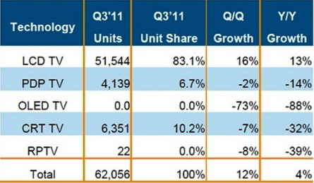 • 2011年第三季全球電視總出貨量較去年上升3.7%