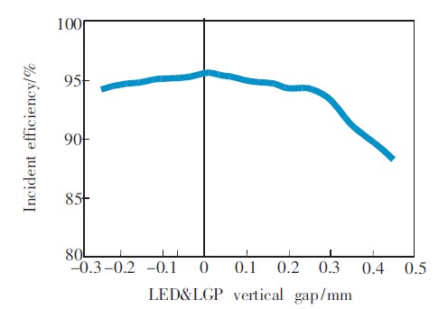 LED發光面和LGP入光面兩者之間的垂直距離通常會被忽略,但如果兩者之間的距離過大,也會嚴重影響入射效率。通過試驗發現,兩者之間的距離在±0.2mm范圍內時,入射效率變化緩慢,且保持在95%左右,所以控制LED發光面和LGP入光面的垂直距離在±0.2mm范圍內即可。
