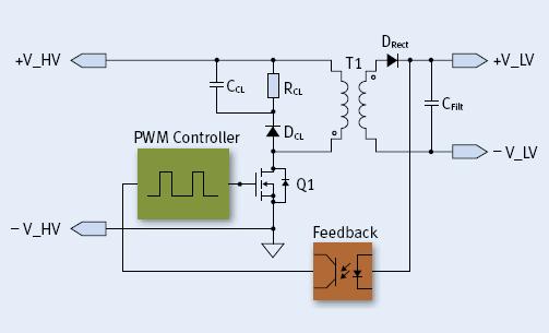 對于最高約100W的隔離電源,反激式拓撲已被廣為接受,因為它相對簡單,構(gòu)成元件少,具有成本效益優(yōu)勢且性能合理。借助飛兆半導(dǎo)體應(yīng)用手冊AN-4137,其基本工作原理簡單并易于解釋。當(dāng)MOSFET Q1導(dǎo)通時,變壓器T1初級端中的電流線性斜升,建立了一個儲存能量的磁場,變壓器繞組的極性點顯示極性滿足條件以致次級端整流器DRect在此期間關(guān)斷。一旦MOSFET斷開,根據(jù)楞次定律(Lenz''s law),跨越變壓器的所有電壓的極性反轉(zhuǎn)。DRect現(xiàn)在開始導(dǎo)通且儲存在T1中的能量傳送到電容器CFilt中。PWM控制器的占空比(Duty cycle)和變壓器圈比一起決定輸出電壓,其在隔離反饋網(wǎng)絡(luò)的幫助下是穩(wěn)定的。因為初級和次級之間的不完全耦合,即漏電感的存在,網(wǎng)絡(luò)DCL、CCL 和RCL鉗位電壓突升。這對于減少Q(mào)1的電壓應(yīng)力是重要的,但同時也是功率損耗的一個來源,因為RCL中的能量被消耗了。