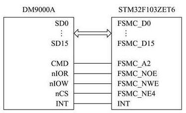 STM32F103ZET6通過FSMC訪問DM9000A,對于STM32F103ZET6來說,DM9000A就是一個靜態存儲器外設。DM9000A采用16位模式,數據線SD0~SD15直接與FMSC數據線低16位FSMC_D0~FSMC_D15相連;DM9000A片選信號線nCS連接至FSMC片選信號FSMC_NE4,這樣DM9000A端口地址為0x6c000000;DM9000A的中斷信號線INT可直接連接至STM32F103ZET6的IO口,在程序中激活處理器IO口的中斷復用功能,STM32以中斷方式接收網卡數據。