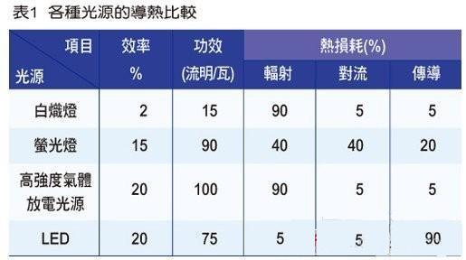在此情況下,約20%輸入功率轉換為光,80%則轉換為熱。這取決于多種因素,發熱可能與底層不規則以及聲子發射、密封、材料等有關。在LED產生的總熱量中,有90%透過傳導傳輸。表1為耗散來自LED接面的熱量,傳導是導熱的主要通道,因為對流和輻射僅占全部熱傳輸約10%。比如一個LED可能轉換近10.72瓦熱量(13.4瓦×0.8)。其中,9.648瓦(10.72瓦×0.9)透過傳導從LED接面傳輸或遷移。顯然,LED光源需要精確的功率和熱管理系統,因為與其他光源相比,提供給LED的電能大部分轉換為熱量。如果沒有適當的熱管理,這種熱量會影響LED壽命和色彩輸出。同時由于LED驅動裝置屬于硅組件,很快就會失效,因此必須配備故障安全備用過電流保護裝置。
