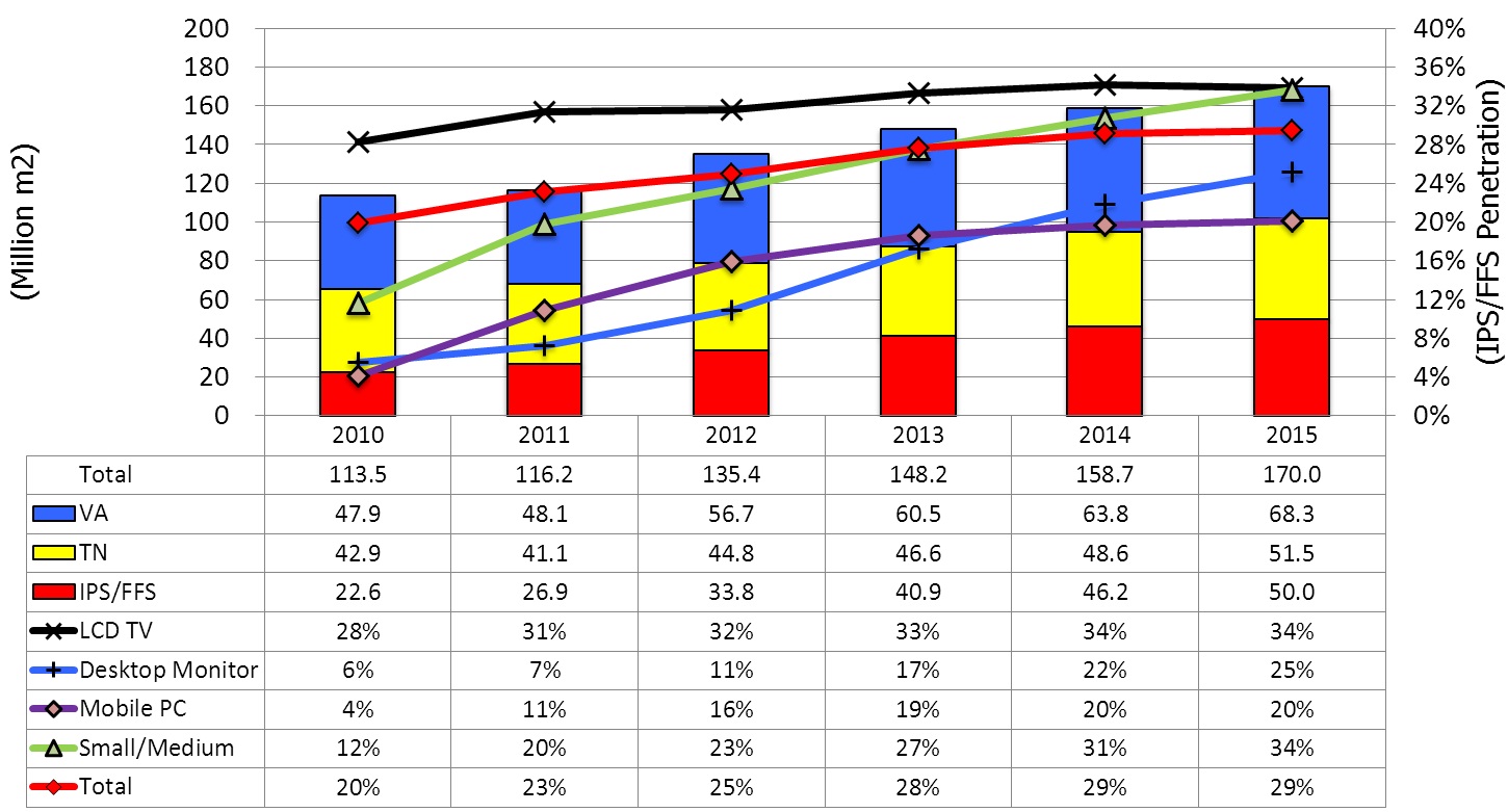 在液晶電視市場(chǎng),廣視角一直是主要的賣點(diǎn)之一,其中IPS/FFS LCD面板的滲透率在2011年達(dá)到31%。在桌上型顯示器市場(chǎng), IPS/FFS 面板傅統(tǒng)上被用在一些特殊應(yīng)用,例如醫(yī)療設(shè)備,2011年滲透率為7%,而NPD DisplaySearch預(yù)測(cè)這個(gè)數(shù)字在2015年將上升到25%,主因于IPS面板的領(lǐng)導(dǎo)生產(chǎn)商LG Display計(jì)劃使IPS成為桌上型顯示器面板的標(biāo)準(zhǔn)。