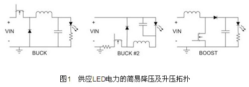 表1的信息可供作選擇LED驅動器最佳切換拓撲的參考。除了這些拓撲之外,也可以使用簡單的電流限制電阻或是線性穩壓器,不過這些方法通常會耗用過多功率。輸入電壓范圍、驅動的LED數目、LED電流、隔離、電磁干擾(EMI)限制以及效能,都是相關的設計參數。大部分的LED驅動電路可分為以下幾種拓撲類別:降壓、升壓、降壓升壓、SEPIC以及返馳。