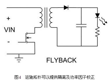 基于安全考慮,可能會規定在脫機電壓及輸出電壓之間進行隔離。此應用方式下,最節省成本的解決方法就是使用返馳轉換器(圖4),在所有的隔離拓撲中,這種作法所需要的組件數量最少。變壓器匝數比可用來對輸出電壓進行降壓、升壓或降壓升壓,設計彈性很大,不過缺點在于電源變壓器基本上是訂制組件。此外,在FET以及輸入和輸出電容器中,也會有高組件應力的情形出現。應用固定燈光時,可以使用「慢速」的回饋控制循環,調節LED電流與輸入電壓同相位的情形,進行功率因子校正(PFC)。這樣可以調節所需的平均LED電流,并能調節輸入電流與輸入電壓同相位的情形,以提供高功率因子。