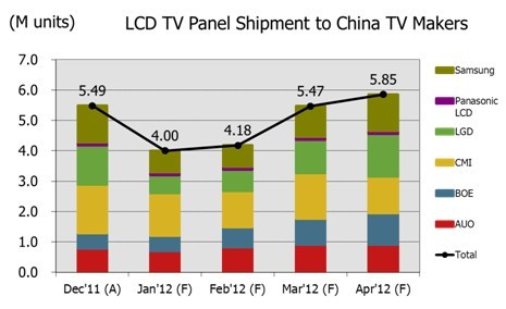 圖一、Dec’11~Apr’12電視面板出貨至大陸電視廠商的數量