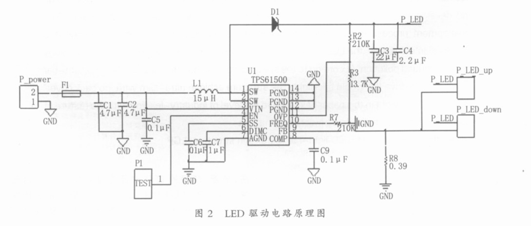 在側光式背光組件中, 應用長條式的LEDlight- bar 作為整個組件的光源,LED light- bar 采用白光頂發光LED.以某機種產品為例,單顆功耗:3.2V×0.02A=0.064W.整個light- bar 功耗:0.064W×42=2.69W.LED 背光源電路設計主要包括發光條設計和驅動控制電路設計,驅動電路采用一款DC/DC 恒流驅動芯片,對發光條進行恒流驅動。圖2 所示為LED light- bar 的驅動原理圖。