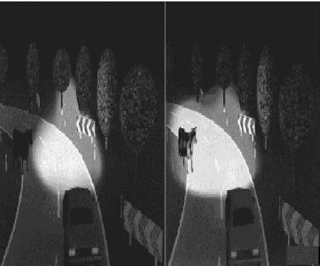 圖9 傳統(tǒng)前照燈( 左) 與AFS 前照燈( 右) 彎道盲點照明效果