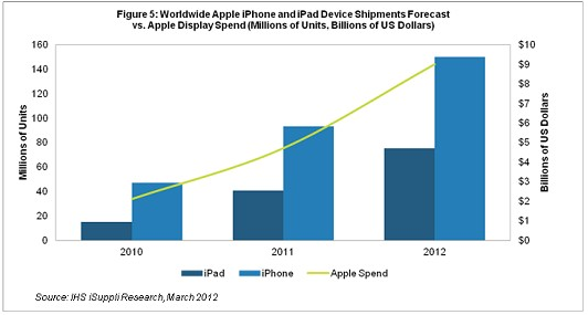 據(jù)IHS iSuppli公司的研究報(bào)告,由于預(yù)計(jì)iPhone和iPad產(chǎn)品出貨量今年大幅增長,蘋果2012年可能在這兩款產(chǎn)品的顯示器面板上面支出90億美元,進(jìn)一步確保其在平板電腦和手機(jī)市場中的主導(dǎo)地位。