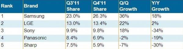 2011年第四季度,三星全球平板電視營收占比提高到26.3%,為所有品牌歷史最高,且較第三季度提高了三個(gè)百分比。此外,在液晶電視和等離子電視方面,三星營收占比仍然遙遙領(lǐng)先,且等離子電視占比首次超過松下而居于首位;三星也是3D電視和LED電視市場的領(lǐng)先品牌。樂金電子為全球第二大品牌,占比為13.4%,且是除了三星以外唯一一個(gè)前五大品牌中在第四季度取得營收成長的品牌。索尼排名第三,營收占比為10%,但較去年同期下降了30%以上。