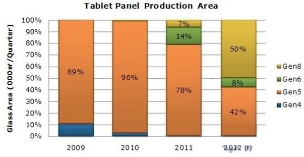 根據最新一季的季度大尺寸面板生產策略報告(Quarterly Large-Area Production Strategy Report)指出,在2011年前五代線為生產平板電腦面板(9”以上)面積最大的主要產線。然而,在2012年八代線將成為平板電腦面板最主要的生產工廠。