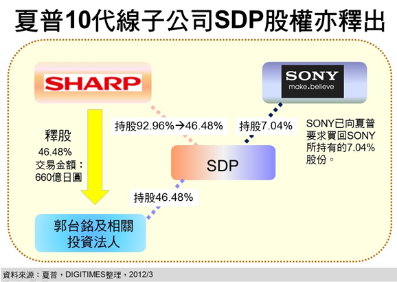 除此之外,黃銘章說明,夏普以10代TFT LCD產線(2,880mm×3,130mm)為主體的子公司Sharp Display Products (SDP),其46.48%股權也將出售給鴻海創辦人及董事長郭臺銘及相關投資人,屆時夏普及鴻海相關投資人將各持有SDP 46.48%股權,剩余7.04%股權原由Sony持有,但3月28日Sony已要求夏普買回此一部分股份。