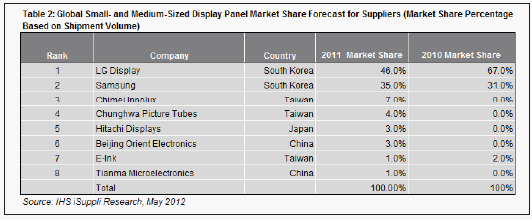 據(jù)IHS iSuppli公司的中小顯示器市場(chǎng)追蹤報(bào)告,LG顯示器和三星顯示器去年是火爆的平板產(chǎn)品市場(chǎng)的最大顯示器面板供應(yīng)商,合計(jì)占有超過(guò)80%的出貨量份額。