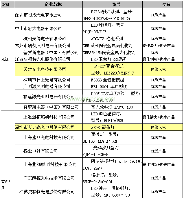 2012年6月9日,2012廣州國際照明展覽會開幕當天,主辦方組織20名終審專家對終審會議評選出來的獲獎候選產品進行現場的考核評審,最終確定35個優秀產品獎,3個最佳創新獎、5個最佳潛力獎的獲獎名單;5個最佳網絡人氣獎是由網友海選出來的名單。