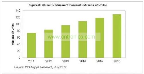 2012年中國市場的PC出貨量預計達到8360萬臺,比去年的7390萬臺增長13%。至少從2008年以來,中國臺式電腦與筆記本的國內出貨量一直保持兩位數的強勁增長,預計這種健康勢頭還將再保持兩年,直到2015年溫和放緩至9%。