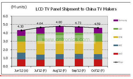 大陸廠商面板采購量在經歷6月份的溫和成長之后,預計7月采購量將成長8%(M/M)、8月成長3%(M/M),而到9月份將衰退1-3%(M/M)。假如面板廠商8月份出貨達成計劃,那么8月份中國廠商的面板采購量將成為全年度最高的月份。但根據過去的幾個月來看,面板廠商一般達標率都會低于預期約6個百分點左右。我們認為面板廠商出貨計劃可能持續偏高,若2012年第三季需求無顯著成長,面板廠商在持續較高渠道庫存狀況下也將趨于謹慎。
