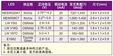 LED技術持續快速改進,制造商在使用新的材料、制造技術和LED設計來為同等大小的電流釋出更大的光輸出,這樣一來,幾年前需要4個LED進行背光的顯示屏如今可能采用2個LED就能實現同樣的背光亮度。不僅如此,過去通常使用冷陰極熒光燈(CCFL)進行背光的4到7英寸較大顯示屏,如今正在轉向使用LED進行背光。此外,LED的正向電壓正趨向更低。因此,不僅需要考慮驅動器制造商的數據表曲線上的驅動器效率,還需要基于采用所選LED對驅動器進行的評估來予以考慮。表1列舉了幾款LED的一些重要規范,顯示了這些LED在正向電壓和發光亮度等方面的差別。需要說明的是,正向電壓范圍的變化較大,這意味著驅動器的效率應該采用LED規范的極限值來進行評估。