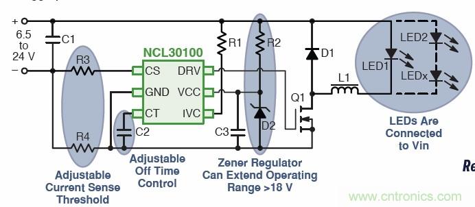 針對空間及高能效要求的低功率應用,安森美半導體提供一款能效高達95%,又具有自然LED開路保護的固定關閉時間降壓LED驅動器控制器NCL30100。該器件采用準固定關閉時間、峰值電流遲滯控制方法,不要求補償元件;其低邊N-FET開關拓撲適合連續導電模式工作,無須輸出電容;其工作頻率小于500 kHz,±5%典型穩流容限,VCC工作電壓范圍為6.35至18 V。