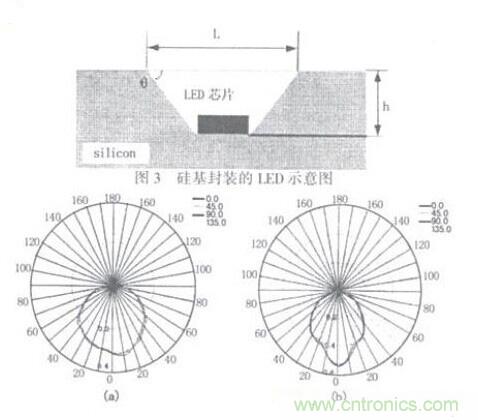 MEMS技術(shù)是隨著半導(dǎo)體和微電子技術(shù)的發(fā)展麗發(fā)展起來的一項(xiàng)新興的細(xì)微加工技術(shù),加工尺寸從毫米到微米數(shù)量級(jí),甚至亞微米的微小尺寸:其加T藝主要分為表面工藝和體工藝。基于硅基的體工藝又稱為體硅工藝,體硅工藝呵以在硅基體上形成高深寬比的凹稽。由于MEMS的加工尺寸很小,因此利用該技術(shù)形成的微小凹槽作為LED芯片封裝的反射腔(如圖3),將會(huì)克服目前LED芯片直接封裝在PCB板上而引起發(fā)光效率低的問題;同時(shí)由于硅具有良好的導(dǎo)熱特性,因此可以降低目前封裝中熱阻高的問題,從而提高LED芯片的發(fā)光效率和可靠性。圖4(a)和(b)給出了當(dāng)LED芯片直接貼裝在PCB板上和貼裝在有凹槽的硅基上的發(fā)光特性。從圈中可以看出,LED貼裝在帶有凹槽的硅基上以后其發(fā)出光的發(fā)散性能得到了很大的改善,LED的發(fā)光強(qiáng)度提高了75%以上。