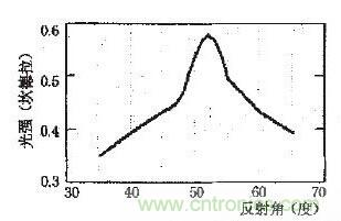 圖5為LED發(fā)射光與反射的反射角θ之間的關(guān)系,從圖中可看出當(dāng)反射角為52度的時(shí)候反射光強(qiáng)取得最大。從理論上講,硅凹槽反射角應(yīng)該設(shè)計(jì)為52度。但是,考慮到對(duì)(100)硅進(jìn)行腐蝕的時(shí)候,其(111)面和(100)面會(huì)自動(dòng)形成一個(gè)54.7度的角,而通過仿真分析結(jié)果可以計(jì)算。當(dāng)反射角為54.7度的時(shí)候。LED的反射光強(qiáng)只比反射角為52度的時(shí)候小12%,而且光強(qiáng)分布也比較接近。因此在腐蝕凹槽的時(shí)候可以直接采用硅的(100)面和(111)面形成角度作為反射角,這可以極大的簡化加工工藝,降低制造成本,而且對(duì)LED光強(qiáng)的影響也不是很大。