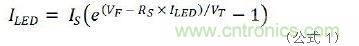下面是圖1a行不通的原因所在。在公式1中,IS、RS是常數(shù),取決于LED產(chǎn)品本身,與VT是熱電壓無關(guān)。假設(shè)串聯(lián)電阻RS是理想值零,那么僅0.1V的VF變化就會(huì)產(chǎn)生47倍的ILED差異。