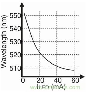 這時(shí)候,需要考慮電流變化對(duì)LED光輸出波長(zhǎng)值的影響。改變波長(zhǎng)就意味著改變?nèi)搜劭吹降纳省D4是綠色LED燈的實(shí)例。通常在業(yè)界,510nm 廣泛代表綠色。因此,大部分LED燈制造商所設(shè)計(jì)的LED燈產(chǎn)品在最大額定電流下都具備510nm的波長(zhǎng)。在圖4中,隨著LED電流的升高,波長(zhǎng)可達(dá)到510nm。獲得綠色的最佳方法是盡量使燈的驅(qū)動(dòng)電流接近最大額定值。這也就說明了為什么使用數(shù)字控制比使用模擬控制好。