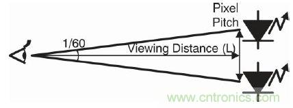 一套LED顯示系統(tǒng)包含大量的LED燈和一個(gè)大電源。設(shè)計(jì)系統(tǒng)時(shí)需要重點(diǎn)考慮LED燈的密度優(yōu)化問題。LED 燈的該密度稱為每個(gè)像素的距離或像素間距。如果像素間距太密,一旦超出了人眼能識(shí)別的精度,它就不會(huì)改善影像輸出質(zhì)量,而且會(huì)增加成本。人眼可識(shí)別的兩個(gè)單光源是在這兩點(diǎn)形成1個(gè)弧度的1/60(=1 弧分)時(shí)。