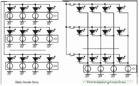 從圖2可以看出,LED燈的陰極采用當(dāng)前市場(chǎng)常見的LED驅(qū)動(dòng)器IC驅(qū)動(dòng)。這里要討論LED燈的陽極驅(qū)動(dòng)器電路。陰極采用恒流驅(qū)動(dòng)器有優(yōu)勢(shì),陽極希望也只提供足夠的電壓。但仍需做出如何驅(qū)動(dòng)陽極的重要決定!
