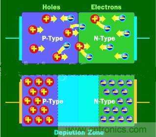 因此,電子空穴本身就顯示出是從正電區域流向負電區域。二極管是由N型半導體物質與P型半導體物質結合,每端都帶電子。這樣排列使電流只能從一個方向流動。當沒有電壓通過二極管時,電子就沿著過渡層之間的匯合處從N型半導體流向P型半導體,從而形成一個損耗區。在損耗區中,半導體物質會回復到它原來的絕緣狀態--所有的這些“電子空穴”都會被填滿,所有就沒有自由電子或電子真空區和電流不能流動。