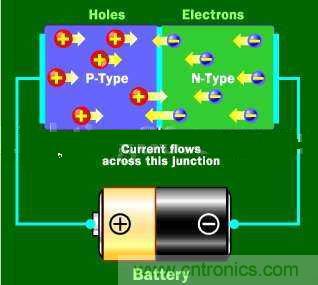 為了除掉損耗區就必須使N型向P型移動和空穴應反向移動。為了達到目的,連接二極管N型一方到電流的負極和P型就連接到電流的正極。這時在N型物質的自由電子會被負極電子排斥和吸引到正極電子。在P型物質中的電子空穴就移向另一方向。當電壓在電子之間足夠高的時候,在損耗區的電子將會在它的電子空穴中和再次開始自由移動。損耗區消失,電流流通過二極管。
