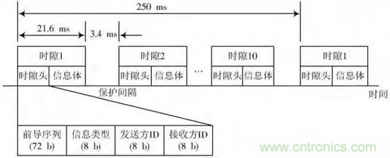以容量為10人的紫外光語音通信系統為例說明數據幀結構的設計。考慮到通常情況下人講話的語速為每分鐘160~180個漢字,在保留一定余量的情況下,假設每分鐘240個漢字,如果壓縮后的語音信號速率為4.8Kb/s,可以算出平均每個漢字時間內的比特數為1200b。據此設計的數據幀結構如圖3所示,其中數據的信息速率為60Kb/s,信息體長度為1200b,時隙頭長度為96b。時隙頭包括前導序列、信息類型、發送方代號和接收方代號,長度分別為72b,8b,8b和8b。每一個用戶只處理接收代號和自己的代號一致的時隙。收發雙方作為一個組合占用相鄰的兩個時隙。前導序列為0,1交替的序列,信息類型的定義如表1所示。