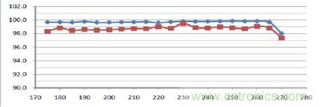 圖中的藍(lán)色為恒流源本身的效率,紅色為包括了整流器在內(nèi)的全部電源的效率。由圖中可見(jiàn)當(dāng)市電電壓從175V增加到265V時(shí),它的效率一直保持在99%以上。這樣高效率的恒流源,放到鋁基板上以后就基本上不會(huì)增加鋁基板的熱量,也就不會(huì)降低光引擎的熱光效,更不會(huì)降低光引擎的壽命了!此外它的效率也不隨溫度而變化: