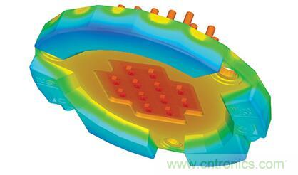 LED燈具設計師所面臨的挑戰是如何將所有這些東西都放在可用的空間中,同時確保成品內部和外部關鍵點的溫度保持在可接受的范圍內。這時候,熱模擬就能起到作用,特別是在整個設計過程中。圖2示出了在熱模擬下有良好散熱的芯片模塊范例。