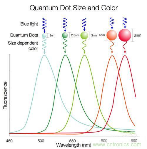 不同大小尺寸的量子點會發出不同的顏色,量子點當受到光或電的刺激時,就發出有色光線,光線的顏色由量子點的組成材料和大小形狀決定,一般顆粒越小,會吸收長波,顆粒越大,會吸收短波。
