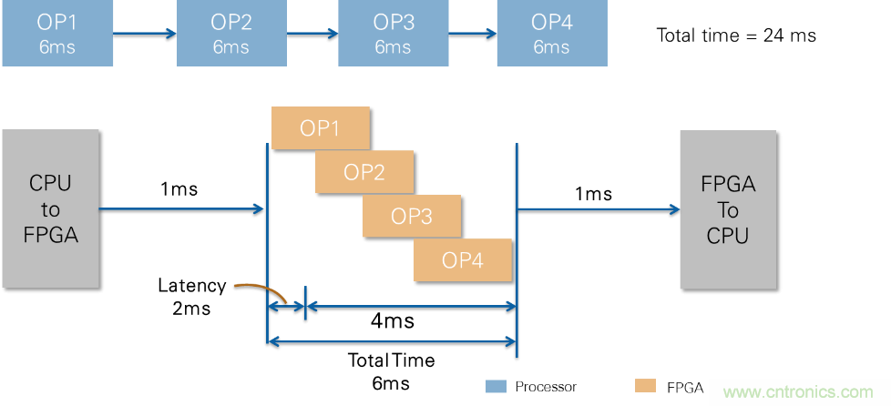 CPU按順序執行操作,因此第一個操作必須在整個圖像上運行結束后,第二個操作才能啟動。在本例中,假設算法中的每個步驟在CPU上運行需要6ms;因此,總處理時間是24毫秒。現在考慮在FPGA上運行相同的算法。由于FPGA本質上是大規模并行的,所以該算法中的四個操作可以同時對圖像中的不同像素上操作。這意味著接收第一個處理的像素僅需2ms的時間,處理整個圖像需要4ms的時間,因而總處理時間為6ms。這比CPU的執行速度快得多。即使使用FPGA協處理架構并將圖像傳輸到CPU,整個處理時間(包括傳輸時間)也比單獨使用CPU要短得多。