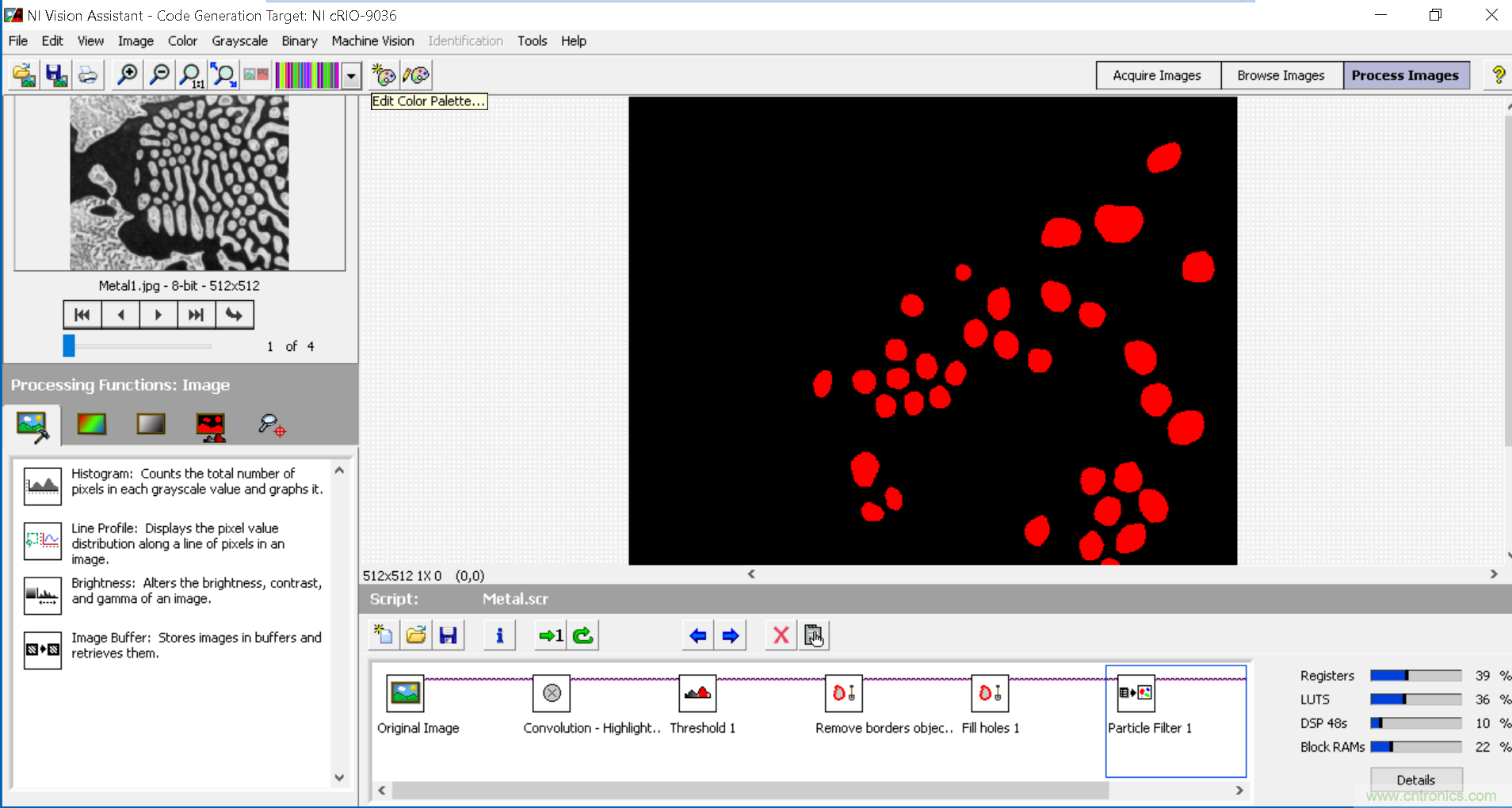 為了實現生產率的最大化,不論使用哪種處理平臺,都需要立即獲得關于算法的反饋和基準測試信息。當使用迭代探索性方法時,實時查看算法結果將會節省大量時間。什么是正確的閾值?用二進制形態濾波器剔除的顆粒多大或多小?哪種圖像預處理算法和算法參數可以最好地清理圖像?這些都是開發視覺算法時的常見問題,而關鍵在于是否能夠更改并快速查看結果。然而,傳統的FPGA開發方法可能會減緩創新,因為算法的每個設計變化之間需要編譯時間。克服這一點的一個方法是使用一個算法開發工具,可讓您在同一個環境進行CPU和FPGA的開發工作,而不會在FPGA編譯時陷入困境。NI Vision Assistant是一種算法工程工具,用于開發部署到CPU或FPGA上的算法,以幫助您簡化視覺系統設計。您還可以使用Vision Assistant在目標硬件上編譯和運行之前測試算法,同時輕松訪問吞吐量和資源利用率信息。